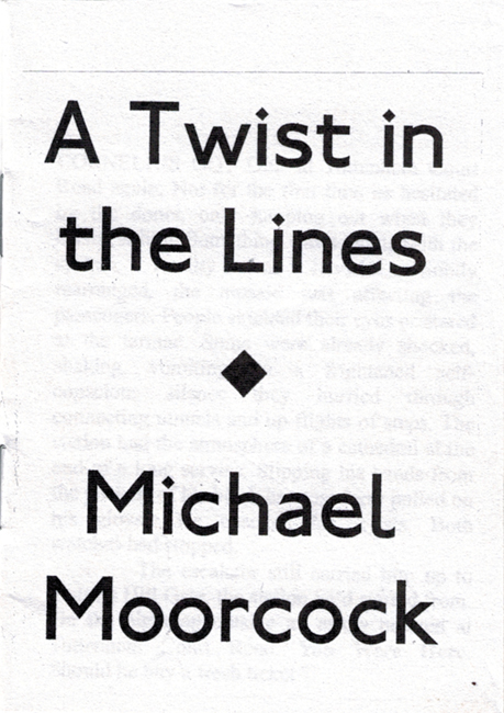 A Twist in The Lines is a standalone edition of a 2011 short story. According to Piece of Paper Press, “Each book is manufactured from a single A4 sheet that is printed on both sides using a photocopier or a domestic printer, and then folded, stapled and trimmed by hand to create the book”. Despite also stating (in promotional material) that “Piece of Paper Press is delighted to present the first publication – in a limited, numbered edition of 150 copies – of ‘A Twist in the Lines’, a new Jerry Cornelius story by Michael Moorcock”, it was in fact first published in Multiverse Expanded (in association with a 2011 exhibition of the same name at the Akershus Kunstsenter gallery in Norway). The story was also later collected in London Bone And Other Stories (2016).