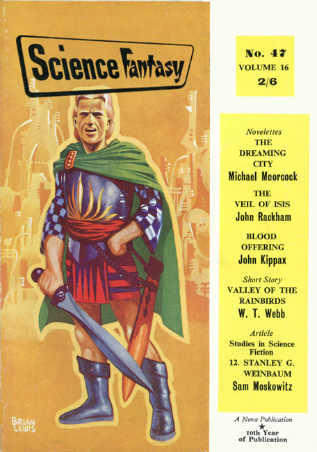 Strictly speaking, the first artistic depiction of the character to be published was by Brian Lewis for the front cover of Science Fantasy No. 47 (q.v.), in which Elric made his very first appearance in ‘The Dreaming City’, where he is described as: