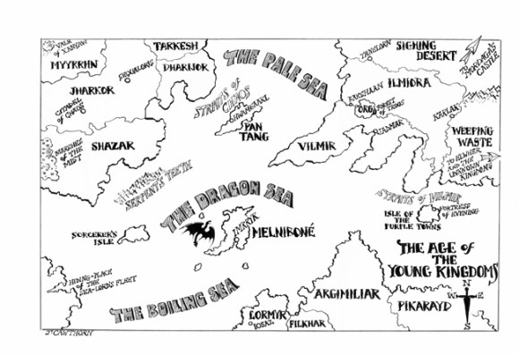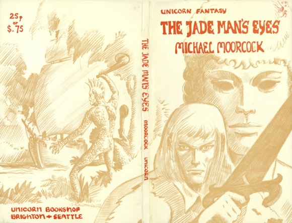For some considerable time before Elric’s initial appearances in Science Fantasy, Michael Moorcock and artist James Cawthorn had been collaborating on textual and visual concepts for the series. Cawthorn provided two cover illustrations for that magazine (Nos 55 & 63), both of which far more represented the character as envisaged by its creator, and he later depicted the definitive Elric portrait for the first edition of Moorcock’s Stormbringer (Herbert Jenkins, 1965). He went on to produce cover artwork for The Sleeping Sorceress (New English Library, 1971) and The Jade Man’s Eyes (Unicorn, 1973), as well as various other volumes’ interior illustrations and a number of maps of the Young Kingdoms of Elric’s world.