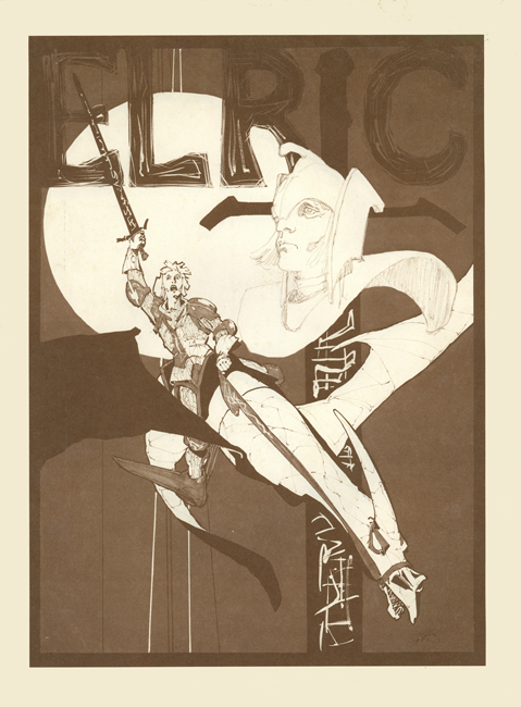 When, a year later, the portfolio was reprinted and bound (minus one piece) in Britain by Unicorn, as Elric: The Return To Melnibone (sic) — text by Moorcock — it ran into some complicated copyright difficulties, and it was finally agreed to allow the small print run to expire, never to be reprinted.