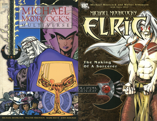 Then in 1997 Moorcock began scripting his own strips for the first time in many years with Michael Moorcock’s Multiverse (twelve issues, Helix/D.C., 1997/’98), comprising three interlinked adventures all by different artists, ‘Moonbeams And Roses’ (with Walter Simonson), ‘The Metatemporal Detective’ (with Mark Reeve) and ‘Duke Elric’ (with John Ridgway). Moorcock would later join forces again with Simonson (& Steve Oliff) for Elric: The Making Of A Sorcerer (four issues, D.C., 2004–’06).