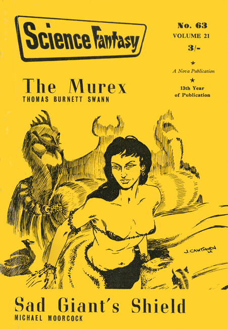 For some considerable time before Elric’s initial appearances in Science Fantasy, Michael Moorcock and artist James Cawthorn had been collaborating on textual and visual concepts for the series. Cawthorn provided two cover illustrations for that magazine (Nos 55 & 63), both of which far more represented the character as envisaged by its creator, and he later depicted the definitive Elric portrait for the first edition of Moorcock’s Stormbringer (Herbert Jenkins, 1965). He went on to produce cover artwork for The Sleeping Sorceress (New English Library, 1971) and The Jade Man’s Eyes (Unicorn, 1973), as well as various other volumes’ interior illustrations and a number of maps of the Young Kingdoms of Elric’s world.