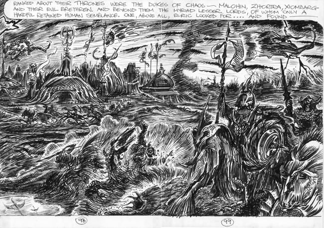 “He was the original Elric illustrator, the very best Elric illustrator, born to draw Elric. We all anticipated that, sometime in the future, he would do the definitive Elric graphic novel. But when I approached him to re-do and expand Stormbringer at a more leisurely pace some years later, he found it impossible to do.