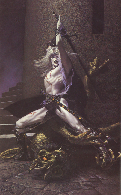 “… tall, broad-shouldered and slim-hipped. He wore his long hair bunched and pinned at the nape of his neck and, for an obscure reason, affected the dress of a Southern barbarian. He had long, knee-length boots of soft doe-leather, a breastplate of strangely wrought silver, a jerkin of chequered blue-and-white linen, britches of scarlet wool and a cloak of rustling green velvet. At his hip rested his runesword of black iron — the feared Stormbringer, forged by ancient and alien sorcery.
