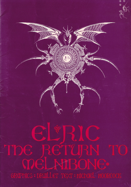 Elric: The Return To Melniboné is a short, original graphic novel. It remains, despite its comparative irrelevance to the overall series, one of the scarcest and most sought-after of Elric books. This is the result of its somewhat chequered history, a saga complex enough to rival Elric’s own. It is actually little more than a showcase for the exquisite artwork of Philippe Druillet, beginning life in 1966 as double-spread colour illustrations for the only issue of a French magazine, Moi Aussi, with text by Maxim Jakubowski. In 1969, Druillet illustrated an omnibus called Elric Le Necromancien, and in 1972 some of this (and new) artwork was put into a twenty-one piece portfolio as La Saga D’Elric Le Necomancien, this time with text by Michel Demuth. All of this work up until then was unauthorised, but when the portfolio was reprinted and bound (less one piece) in the U.K. as Elric: The Return To Melnibone (text by Moorcock), Druillet threatened to sue. Moorcock was forced to step in on behalf of the British publishers, pointing out that permission had never been granted for Druillet to draw Elric in the first place. In order to avoid messy litigation, it was decided to allow the small print run to expire, never to be reprinted. However, a republication was finally agreed, the book made available again in 1997 as Elric: The Return To Melniboné — with minor textual amendments; also restoring its original black-and-white format, the earlier edition having been printed in a rather lurid and of-its-time, near-fluorescent purple — and it was later collected (alongside James Cawthorn’s 1976 graphic adaptation of Stormbringer) in 2021’s Elric: The Eternal Champion Collection.