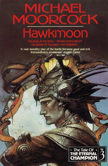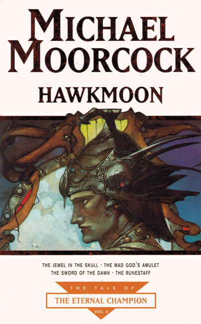 An omnibus of the first of two separate series featuring Duke Dorian Hawkmoon von Köln — collecting (with texts revised in 1977) the novels The Jewel In The Skull (1967), The Mad God’s Amulet (1968/’69), The Sword Of The Dawn (1968) and The Runestaff (1969) — Hawkmoon was retitled from The History Of The Runestaff (unrevised, 1979), and was later retitled Hawkmoon: The History Of The Runestaff (2013).