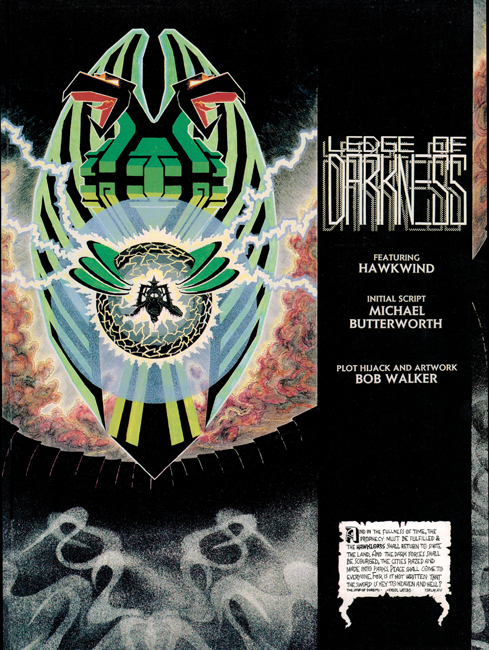Not a book by Michael Moorcock, Ledge Of Darkness is in fact the graphic-novel final volume in a trilogy of titles (mostly) by author and Savoy Books co-founder Michael Butterworth, “based on an idea by Michael Moorcock”. It was preceded by two textual novels, The Time Of The Hawklords (1976, originally credited to both Moorcock & Butterworth) and Queens Of Deliria (1977, by Butterworth), all three featuring the Hawklords, “entirely fictitious [characters] based on roles used by members of Hawkwind on stage and recorded performances”. Originally announced as a third novel to be called The Quest Of The Life Sword, subsequent years saw that morph into Ledge Of Darkness (a concurrently announced alternative title), a graphic novel with an “initial script” by Butterworth and “plot hijack and artwork” by Bob Walker. Never (initially) sold as a standalone publication, it was only available as part of a four-C.D. box set called Hawkwind: 25 Years On (see below)…