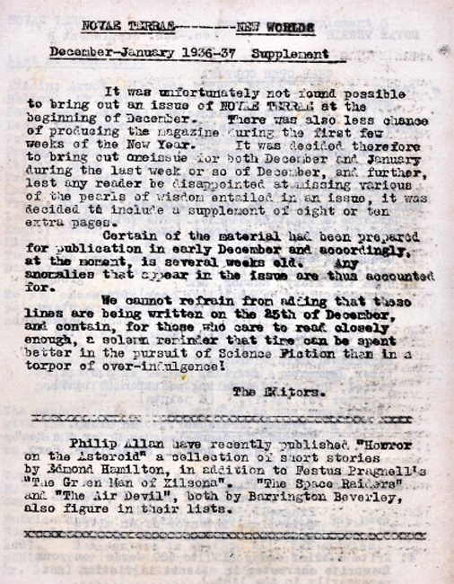 p. 2: ‘Novae Terrae ——— New Worlds’ (as ‘Editorial’ on Contents page; uncredited, presumably Maurice K. Hanson);