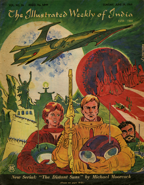 Its first appearance was the eighteen-part weekly serialisation of the entire novel in The Illustrated Weekly Of India in 1969, the book itself being published in March 1975. It was written in collaboration with (and illustrated by) James Cawthon, although the serial was credited Moorcock alone who “was approached by the London editor … who told me that he and his colleagues in the firm were very concerned about the slowness of Indian society’s acceptance of practical science and its benefits. He asked me if I would be interested in writing a serial for the weekly whose huge audience was unfamiliar with science fiction as a moral or didactic medium … The use of various characters from the Cornelius stories … was inspired by the notion of putting the same characters in thoroughly different periods and backgrounds and seeing what happened.”