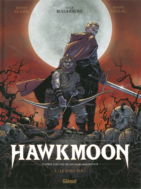 Hawkmoon 3: Le Dieu Fou, 2024 (May 15th); written by Le Gris, art by Bulgheroni&Dellac; original price: unknown (“Code Prix GL57”?); 56 pages; I.S.B.N.: 978-2-344-02791-2; cover artist: Bulgheroni&/orDellac.