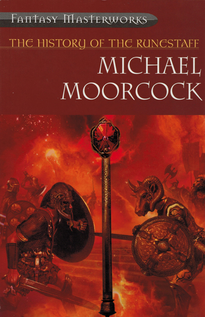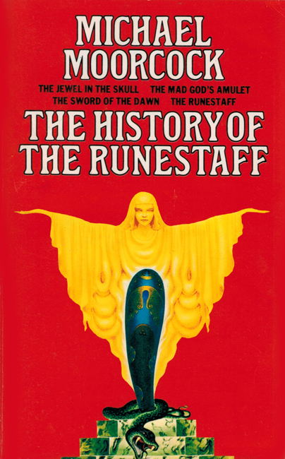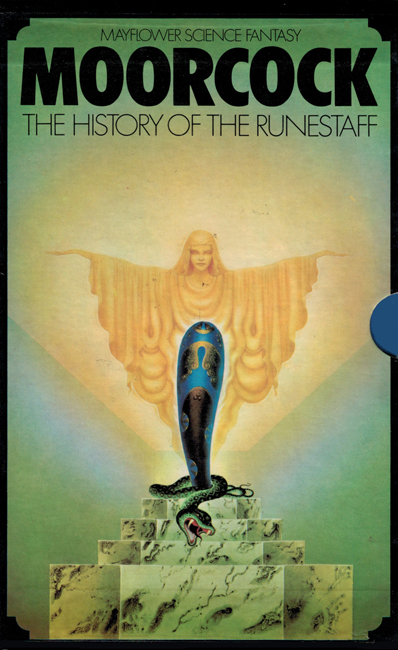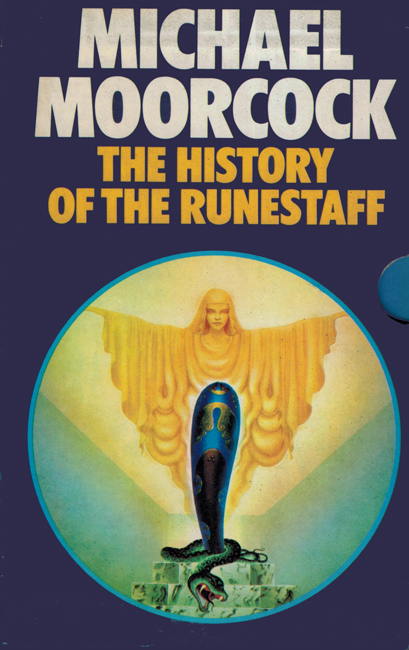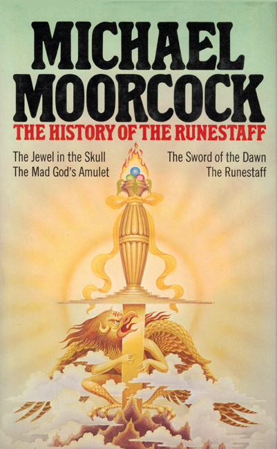 The History Of The Runestaff is an omnibus of the first of two separate series featuring Duke Dorian Hawkmoon von Köln, collecting The Jewel In The Skull (1967), The Mad God’s Amulet (1968/’69), The Sword Of The Dawn (1968) and The Runestaff (1969). It was preceded by a paperback box set (c. 1973), before being bound in 1979 as a single hardcover volume which was later retitled in that format (but with texts revised in 1977) as Hawkmoon (1993) and Hawkmoon: The History Of The Runestaff (2013).